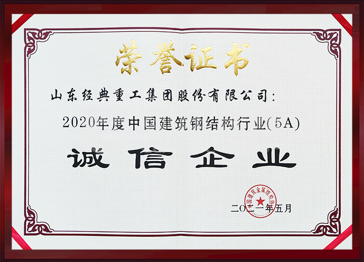 中國建筑金屬結構協會通報2020年度建筑鋼結構行業競爭力50強企業,公司位列17位;榮獲2020年度中國建筑鋼結構行業(5A)誠信企業。