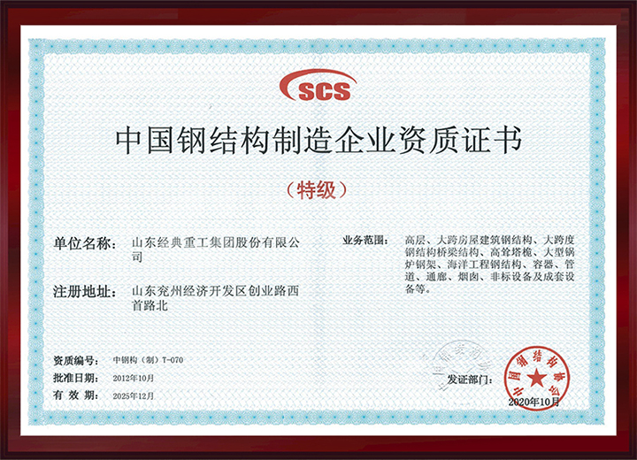 取得中國鋼結構制造特級資質。