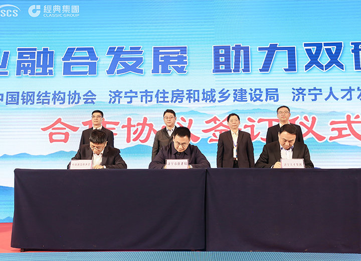 中國鋼結構協會、濟寧市住房和城鄉建設局、濟寧人才發展集團三方人才合作簽約儀式。