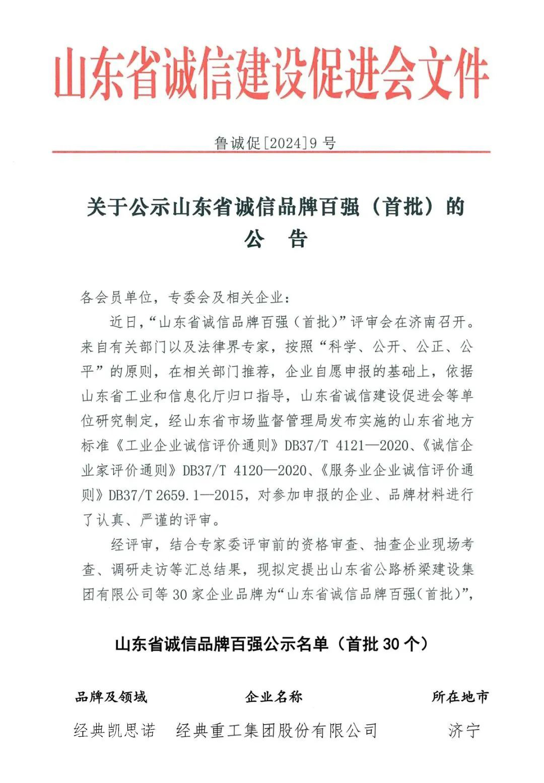 近日,山東省誠(chéng)信建設(shè)促進(jìn)會(huì)發(fā)布了《關(guān)于公示山東省誠(chéng)信品牌百?gòu)?qiáng)(首批)的公告》,其中經(jīng)典重工集團(tuán)股份有限公司“經(jīng)典凱思諾”品牌成功入選。
