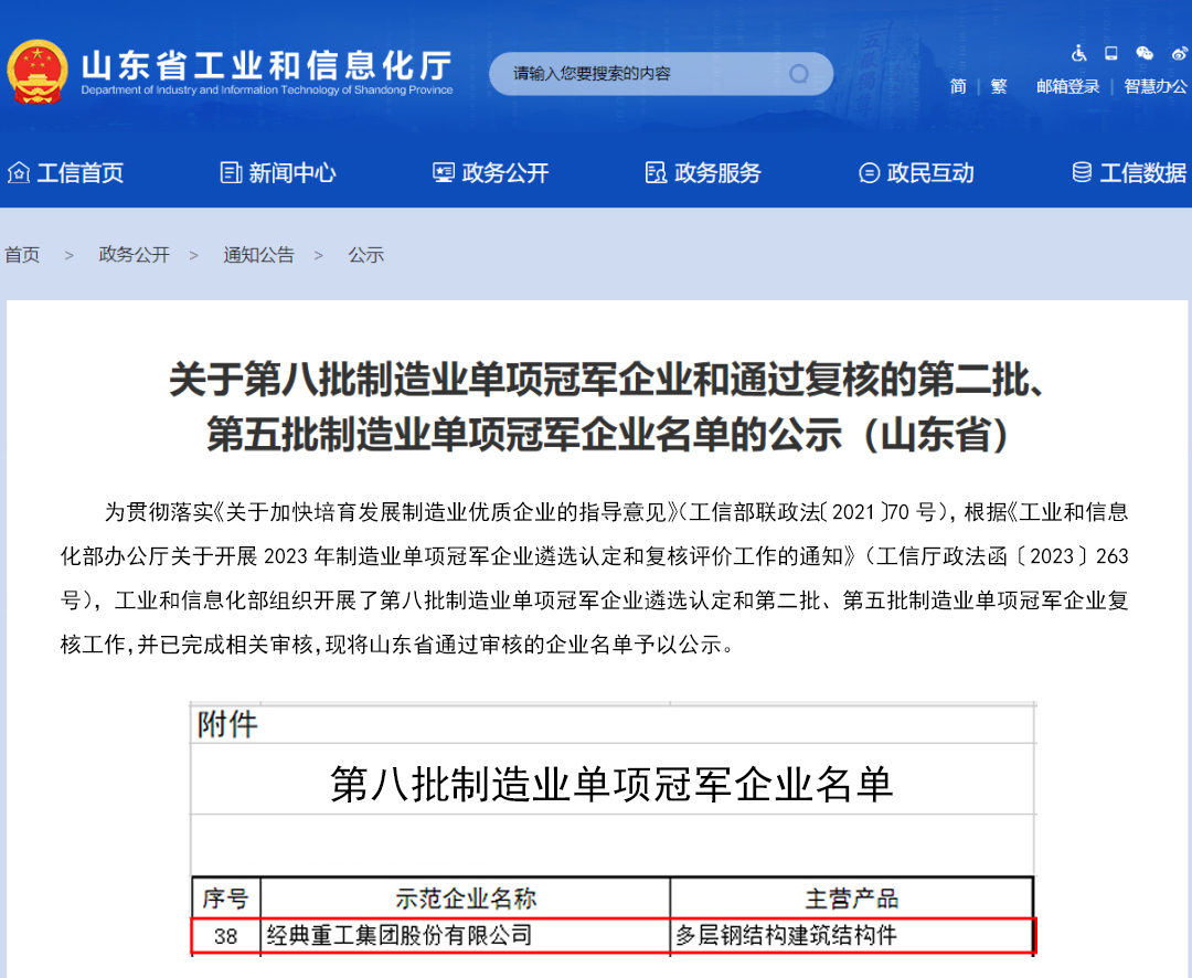 近日,工業(yè)和信息化部第八批制造業(yè)單項冠軍示范企業(yè)名單公示,經(jīng)典重工集團股份有限公司位列其中,是該榮譽歷批次認(rèn)定中唯一一家建筑鋼結(jié)構(gòu)行業(yè)民營企業(yè)。