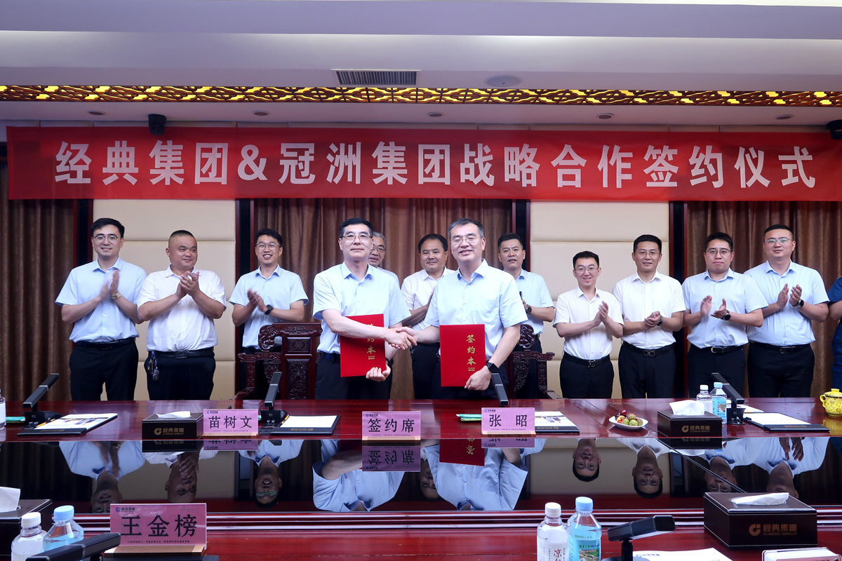 6月13日上午,經(jīng)典重工集團(tuán)股份有限公司與山東冠洲股份有限公司簽訂戰(zhàn)略合作協(xié)議。經(jīng)典集團(tuán)董事會主席苗樹文、冠洲董事長張昭代表雙方簽訂戰(zhàn)略合作協(xié)議并講話。經(jīng)典集團(tuán)副總經(jīng)理鄭建康、王金榜、張爭,冠洲宋總出席簽約儀式。