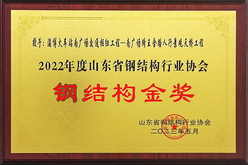 6月16—18日在環(huán)渤海地區(qū)鋼結(jié)構(gòu)行業(yè)發(fā)展峰會(huì)暨山東省鋼結(jié)構(gòu)行業(yè)協(xié)會(huì)年會(huì)上,山東經(jīng)典重工集團(tuán)股份有限公司承建的淄博火車站南廣場(chǎng)交通樞紐工程——南廣場(chǎng)跨王舍路人行景觀天橋工程榮獲2022年度山東省鋼結(jié)構(gòu)協(xié)會(huì)鋼結(jié)構(gòu)金獎(jiǎng)。